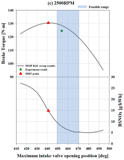 To vary the intake valve opening and closing event, maximum intake valve opening positions were treated as a parameter. For optimization, the timing of the intake valve was adjusted to determine the changes in torque and NOx through overlap with the exhaust valve, and then the optimization range of the valve overlap was selected. The expression, “feasible region” in Figure 10, represents the allowable intake valve opening positions where similar torque can be obtained compared to toque level and lower NOx emission can be found compared to NOx from base engine operating conditions.