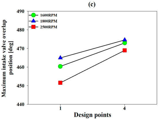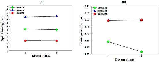 Figure 13a shows the change in spark timing, and it can be confirmed that there is no significant change in the process of changing from point 1 to 4. Figure 13b shows that the boost pressure showed a slight change at 1800 RPM and 2500 RPM, but it was confirmed that the boost pressure reduced when the minimum NOx amount and minimum torque performance were observed at 1600 RPM. For this reason, it can be seen that the lower the RPM, the greater the performance and the amount of exhaust gas are affected by the boost pressure. Figure 13c shows the effect of IVO, confirming that the overlap interval decreased toward point 4, where the amount of NOx decreased to a minimum at all the RPMs. In addition, it was confirmed once again that the emission of exhaust gas was greatly affected by valve timing, as shown in Figure 11b. Through the multi-objective Pareto optimization, it was confirmed that IVO control is an effective way to optimize torque and NOx emissions in a non-road gasoline MPI turbo SI engine.