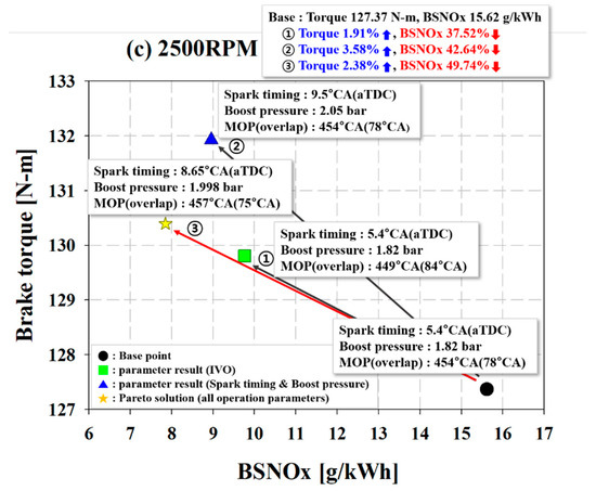 - Figure 14c shows a comparison of the 2500 RPM results. (1) can confirm a 37.52% NOx reduction and a 1.91% torque increase as the overlap intervals widens by 6° CA. (2) had a spark timing that was retarded by 4.1° CA compared to the baseline, but through an increase in boost pressure, the torque increased by 3.58% and NOx decreased by 42.64%. It can be seen that spark timing and boost pressure may offset one another. (3) offset the effect of the retarded spark timing through an increase in boost pressure and the decreased overlap interval; as a result, a 2.38% torque increase and 49.74% NOx decrease compared to the baseline were obtained.
