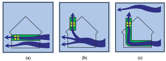 Types of Hybrid ventilation (Annex 35). (a) Natural and mechanical ventilation. (b) Fan-assisted ventilation. (c) Stack and wind-assisted mechanical ventilation.