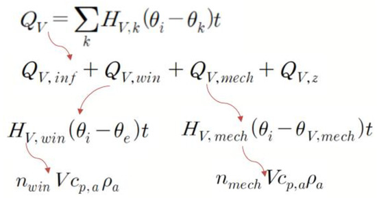 In DIN V 18599-2, the calculation of heat loss (gain) caused by the ventilation is defined in Formulas (2)–(13). The structure of the calculation formula is shown in Figure 2. Ventilation heat loss (gain) () comprises infiltration (), window ventilation (), mechanical ventilation (), and heat loss in adjacent zones (), wherein hybrid ventilation heat loss relates to window heat loss (gain) () and window ventilation heat coefficients (). and are indoor and outdoor temperature; t is time.
