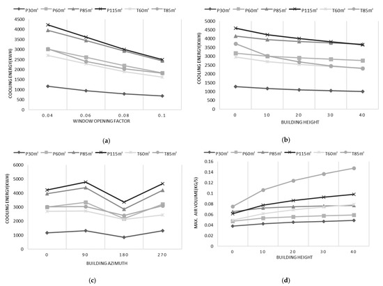 Comparison of hybrid ventilation results according to variable conditions. (a) Cooling energy according to the change in window opening factor (azimuth: 0, height: 10 m fixed). (b) Cooling energy according to the building height (m) (azimuth: 0, opening factor: 0.04 fixed). (c) Cooling energy according to the change in building azimuth (height: 10 m, opening factor: 0.04 fixed). (d) Max. Air ventilation volume according to the change in building height (m) (azimuth: 0, opening factor: 0.04 fixed).