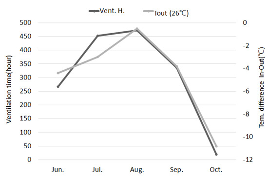 As shown in the Figure 4, the monthly fan operation time and ECO2 monthly average outdoor temperature-indoor temperature difference calculated in EnergyPlus were compared. The two graphs displayed very similar changes. Therefore, the monthly fan operation time and average outdoor temperature-indoor temperature difference were used to calculate the monthly fan operation time.