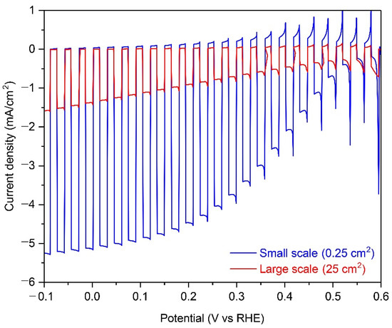 Figure 1 shows the PEC performance of small-scale (0.25 cm2) and large-scale (25 cm2) Cu2O photocathodes with an AZO overlayer, TiO2 protection layer, and RuOx HER catalysts in a pH 5 aqueous solution under chopped one sun illumination. As shown in Figure 1, the onset potential was approximately 0.5 V versus RHE and the photocurrent density reached up to −5.1 mA cm−2 at HER potential (0 V versus RHE) in the small-scale Cu2O photocathode. It is in good agreement with the previous report [25]. On the other hand, the photocurrent density at HER potential was reduced to −1.5 mA cm−2, while the onset potential was not changed in the large-scale Cu2O photocathode. Interestingly, although the composition of Cu2O photocathode was same, the photocurrent density was remarkably decreased when the area of photocathode was increased a hundred-fold. A large area substrate can affect the uniformity of the Cu2O film or the charge transport in the Cu2O photocathode. It influences the PEC performance of the Cu2O photocathode, especially the photocurrent density. Non-homogeneous Cu2O film plays a role as a recombination center, resulting in poor PEC performance [24]. However, it was demonstrated that the electrodeposited Cu2O film is quite homogenous even on the 50-cm2 scaled large FTO substrate, with an approximate thickness of 280~300 nm (Figure S1). Hence, the non-uniformity of Cu2O film can be excluded from the reason for the decreased PEC performance in the large-scale Cu2O photocathode. Therefore, the poor PEC performance of the large-scale Cu2O photocathode is likely due to the ohmic loss by the prolonged charge transport in the large area substrate [14,15,16,17].