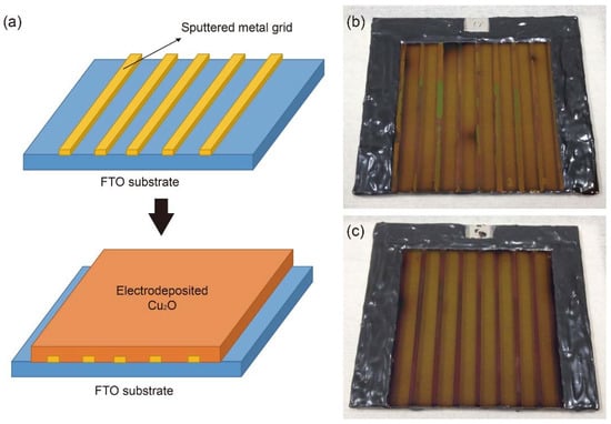Metal grid lines were introduced to overcome this problem in the large-scale Cu2O photocathode because they are a mature strategy for improving the charge transport in the large-scale dye-sensitized solar cells and perovskite solar cells [26,27,28,29]. Table 1 shows the reported conductivity of metals, which were considered as metal grid lines [30,31]. Ag was preferentially considered due to its high conductivity. However, most Ag grid lines peeled off during the electrodeposition of Cu2O. Hence, Cu and Au were alternatively selected because they also have better conductivity compared to other metals, even though they are less conductive than Ag. Figure 2 shows the schematic designs and photographs of 25-cm2 scaled Cu2O photocathodes with sputtered Au and Cu grid lines. Metal grid lines did not hinder the light absorption to the large scale Cu2O photocathode because the Cu2O film was electrodeposited on the metal grid lines (Figure 2a) and the light was illuminated to the Cu2O film side, not the FTO substrate side. It seems that the quality of Cu grid lines (Figure 2c) was better than one of Au grid lines (Figure 2b) in the large scale Cu2O photocathode. Nevertheless, both thicknesses were almost the same at approximately 160 nm and their contacts with Cu2O film were dense and well connected, as shown in Figure 3b,c. In addition, the thicknesses of the Cu2O film (260 nm), AZO overlayer (20 nm), and TiO2 protection layer (100 nm) were almost the same in the part without the grid line (Figure 3a), with the Au grid line (Figure 3b), and Cu grid line (Figure 3c), respectively. It means that all layers of the Cu2O photocathode were homogenously deposited on the grid-embedded large scale substrate.
