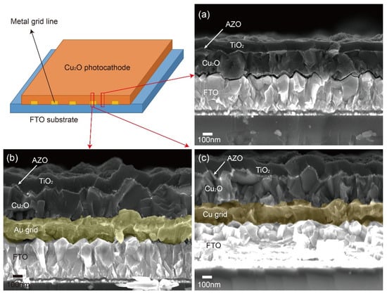 Cross-section scanning electron microscope (SEM) images: (a) The part of the Cu2O photocathode without grid lines, (b) the part of the Cu2O photocathode with Au grid lines, and (c) the part of the Cu2O photocathode with Cu grid lines.