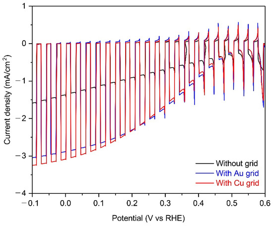 Figure 4 shows the PEC performance of 25-cm2 scaled Cu2O photocathodes without grid lines and with Au or Cu grid lines in a pH 5 aqueous solution under chopped one sun illumination. The photocurrent density at 0 V versus RHE of Cu2O photocathode with metal grid lines were almost double than one of the Cu2O photocathode without metal grid lines, while the onset potential was the same. It is likely due to the improved chare transport by the metal grid lines because other conditions of the Cu2O photocathode were the same, as mentioned in Figure 3. On the other hand, the improvement of photocurrent density in the Cu grid-embedded Cu2O photocathode was slightly higher than one in the Au grid-embedded Cu2O photocathode. It is mainly caused by the different charge transport capabilities of the two metals. Herein, the charge transport capability is affected by the inherent conductivity of metals because the width, length, and thickness of each grid lines are the same [27]. As shown in Table 1, the conductivity of Cu (5.96 × 107 S m−1) is superior to one of Au (4.11 × 107 S m−1), resulting in the further improved PEC performance using Cu grid lines. In addition, the quality of the Cu grid was better than the Au grid (Figure 2b,c). Therefore, it was concluded that the Cu grid is more effective in improving the charge transport in the large-scale Cu2O photocathode, compared to the Au grid.