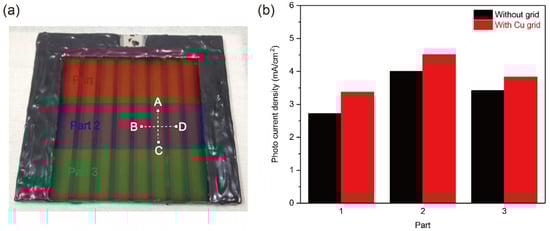 (a) Divided three parts with an active area of 8.3 cm2 for the partial PEC performance measurement and charge flow directions to measure the sheet resistance of the Cu2O photocathode without and with Cu grid lines, and (b) the photocurrent densities of each part without and with the Cu grid lines at 0 V versus RHE in a pH 5 aqueous solution under one sun illumination.