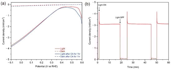 (a) The PEC performance of Cu-grid embedded 50-cm2 Cu2O photocathodes before (red) and after (blue) chronoamperometry (CA) measurement for 60 min under a continuous light condition (solid line) and dark condition (dot line), (b) current density of Cu grid-embedded 50-cm2 Cu2O photocathode during the CA measurement biased at 0 V versus reverse hydrogen electrode (RHE) for 60 min. All tests were carried out in a pH 5 aqueous solution using the light from the warm white LED array with the similar intensity of one sun illumination. All devices include an AZO overlayer, TiO2 protection layer, and RuOx HER catalysts.