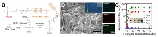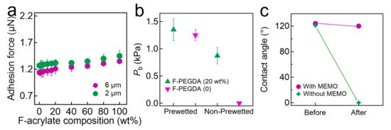 (a) The measured adhesion force of a sessile oil (n-hexadecane) droplet on the filter surfaces coated with F-PEGDA with various F-acrylate concentrations. (b) The breakthrough pressure of oil on prewetted and dry filters coated with F-PEGDA (20 wt.%). The data obtained from a filter coated with neat PEGDA are also provided for comparison. (c) The measured apparent contact angles of oil on the F-PEGDA (20 wt.%), which was prepared with MEMO before and after being submerged in water for 1 h. For comparison, the data for F-PEGDA (20 wt.%) prepared without MEMO are also shown.