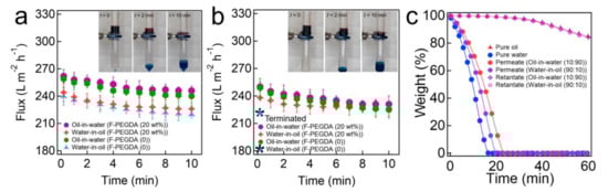 Using our hydrophilic and in-air oleophobic filter, we separated oil-water mixtures under gravity. Here, we utilized a surfactant-stabilized oil-in-water emulsion (10 vol% n-hexadecane in water) and a water-in-oil emulsion (90 vol% water in n-hexadecane) (see Experimental Section and Section S9). The separation apparatus consisted of two vertical tubes and a filter coated with F-PEGDA (20 wt.%), which was sandwiched between them. Here, we utilized a filter with an inherent nominal pore size of 6.0 µm Upon introducing an emulsion (15 mL) into an upper tube, a filter allows the water-rich phase to permeate through, while the oil-rich phase is retained above it within 11.2 ± 2 min (Figure 3a). We also calculated the flux (J = ∆m(Aρ∆t)−1, where ∆m is the mass change of the water-rich permeate in a given time interval (i.e., ∆t = 1 min), A is the projected area of the filter surface, and ρ is the permeate density) values by periodically measuring the volume of the water-rich permeate through filters prewetted with water for 30 min. The results for the oil-in-water emulsion showed that the permeate flux gradually declined from J (t = 0) = 261 ± 10 L m−2 h−1 and reached J (t = 10 min) = 245 ± 10 L m−2 h−1. This can be attributed to the decreased height of the emulsion column as the water-rich phase permeated through the filter, which resulted in a decrease in the exerted pressure. The filter also separated the water-in-oil emulsion in 13.1 ± 2 min. Similarly, the permeate flux values were determined as J (t = 0) = 242 ± 10 L m−2 h−1 and J (t = 10 min) = 225 ± 10 L m−2 h−1. Note that almost all water droplets dispersed in an emulsion can come into contact with the filter surface under gravity. For comparison, we conducted the same experiments using a filter coated with F-PEGDA (0) after prewetting with water for 30 min. The results showed that the filter can separate both oil-in-water and water-in-oil emulsions in 11.9 ± 2 min and 13.5 ± 2 min, respectively (Figure 3a). The permeate flux values were measured as J (t = 10 min) = 239 ± 10 L m−2 h−1 and J (t = 10 min) = 219 ± 10 L m−2 h−1 for the separation of the oil-in-water and water-in-oil emulsions, respectively.
