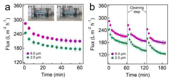 Finally, we continuously separated an oil-in-water emulsion utilizing a cross-flow apparatus (Experimental Section). An emulsion (total volume = 20 L) was gradually introduced into a cell in which a filter (inherent nominal pore size = 6.0 µm. coated with F-PEGDA (20 wt.%) was mounted. We measured the volume of the water-rich permeates every 5 min for the entire 60 min of operation. The TMP value was maintained at 0.90 kPa ± 0.20 kPa. The results showed that J (t = 0) = 285 ± 10 L m−2 h−1, after which it declined and reached J (t = 60 min) = 210 ± 10 L m−2 h−1 (Figure 4a). We conducted the same experiments using a filter with an inherent nominal pore size of 2.0 µm. The results showed that J (t = 0) = 245 ± 10 L m−2 h−1, after which it declined over time and reached J (t = 60 min) = 176 ± 10 L m−2 h−1. Unlike the flux decline during batch separation, which was primarily caused by a decrease in the exerted pressure (see Figure 3a,b), the continuous separation was conducted at a constant TMP. Therefore, we attributed the flux decline to the oil droplet accumulation above the membrane surface [4]. Although our filter exhibits very low oil adhesion forces (see Figure 2a), oil can still accumulate on the surfaces and pore walls due to transmembrane pressure. The accumulation of oil can cause pore blockages. As a consequence, the volume of water passing through the filter in a given period of time (i.e., permeate flux) decreases. This results in a decline of the flux. We cleaned the filter by first rinsing it with ethanol for 10 s followed by washing it with DI water for 30 s (flow rate ≈ 20.0 L min−1). The cleansed filter was subjected to the same separation experiments. The results showed that the filter nearly recovered its inherent flux values (Figure 4b). An analysis of the separation efficiency is included in Section S10. The flux values for the continuous separation experiment over 50 h are presented in Section S11.