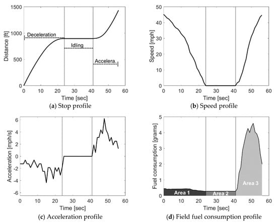 The stop penalty needed to reduce FC was derived based on the fuel consumed during the three driving modes of a complete stop at signalized intersections. These modes are deceleration, idling, and acceleration. An example of field vehicular trajectory of those modes is shown in Figure 1a. The change in speed during those modes can be represented by a Cruising Speed Stop Profile (CSSP), as displayed in Figure 1b. Cruising speeds before deceleration and after acceleration are not necessarily equal. In fact, field data processing, discussed later, showed that it is rare that a vehicle decelerates from a particular cruising speed and accelerates back to the exact original speed. The reality is that the cruising speed after accelerating can be lower or higher than the original cruising speed before stopping. Figure 1c depicts changes in acceleration during a stop event. Finally, the instantaneous FC changes over time during a CSSP are demonstrated in Figure 1d. The total FC of a CSSP is formulated in Equation (4) [23], where all units are identical and can be in gallons, liters, or grams: