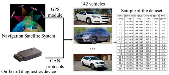 This study investigates the stop penalty by utilizing a dataset provided by the Department of Energy (DOE) [27] and collected by the Idaho National Lab [28]. The dataset includes vehicular trajectories of field trips lasting for 1850 h and covering 41,385 miles of various urban arterials in Michigan, which offers a wide range of collected FC rates under different operating conditions. InMetrics telemetry On-board diagnostics (OBD) recorder from ISAAC instruments (InMetrics telemetry, Ohio, United States) [29], combined with a Global Positioning System (GPS) module, was installed in the tested vehicles, and used to collect the field data. Although the OBD recorder can sample over 40 distinctive parameters with a frequency of up to 10 Hz, only eight parameters were included in the dataset. This study focused on the parameters latitude, longitude, altitude, speed, and mass airflow, and the last one was used to compute FC (more details below). The process of collecting the data with a sample of the utilized parameters are shown in Figure 2.