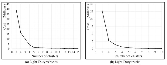 The k-prototype algorithm was applied to the data by using the Python programming language, allowing the user to input categorical and numerical vehicular characteristics for each tested vehicle to cluster vehicles into somewhat homogenous groups. When clustering the vehicles, all tested vehicles were initially divided into LDVs and LDTs because, as discussed earlier, LDVs and LDTs have significantly different FC characteristics. The number of LDV and LDT groups is determined by using the ‘Elbow method,’ which is based on the rate of ‘diminishing returns’. The Elbow method (Figure 3) uses the quality of clustering performance as a function of the number of groups to select a point at the elbow of the curve that indicates the optimum number of groups. From the result of the Elbow method in Figure 3, one can observe that four and three groups are suggested for LDVs and LDTs, respectively. Therefore, all tested vehicles were classified into seven groups identified as LDV1, LDV2, LDV3, LDV4, LDT1, LDT2, and LDT3.
