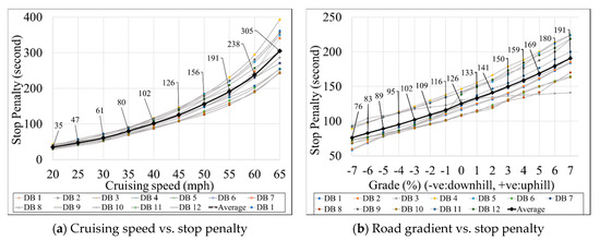 Courage and Parapar [13] were among the first to report a single stop penalty value (60 seconds) using FC measurements of a mixed fleet with a cruising speed of 30 mph and level grade, as reported by Claffey [44]. Akcelik [16] derived the stop penalties for three fleet distributions, one consisting exclusively of light vehicles, another of heavy vehicles, and one composite fleet with 10% of heavy vehicles, which resulted in K values of 54, 104, and 60 s, respectively. Those three stop penalty values are shown in Figure 11 as orange dots with various color intensities for a cruising speed of 37 mph. Reporting the speed at which the stop penalty was computed in both studies [13,16] indicates that the authors of those studies were aware of the importance of cruising speed on the stop penalty. However, the same studies did not collect field FC data for various vehicle types and other important factors (e.g., idling rate, grade), and for that reason, their reported stop penalties would not reflect the impact of those conditions.