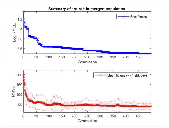 On the other hand, MGGP introduced completely new characteristics and traits and directly derived correlations without assuming prior forms of existing relationships. Figure 8 shows a simple summary example of a run in GPTIPS. The upper part and lower part of Figure 8 show the log10 value of the best RMSE and the mean RMSE achieved over the generations of a run. It is worth mentioning that the log10 value of the RMSE is the error metric that GPTIPS attempts to minimize over the training data.