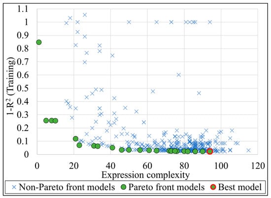 Figure 9 visualizes an example of the training procedure for minimizing the error and simplifying the complexity of the MGGP models during the evolutionary process. The green dots represent the Pareto front of models in terms of model performance and complexity. Blue Xs represent non-Pareto models. The red circled dot represents the best model in the population based on the R2 value on the training data. The final model for each vehicle group was selected based on two criteria, accuracy and model complexity. The developed models are validated with a fresh dataset to evaluate the generalization capability of the developed models. Figure 6(c1–c4) and Figure 7(c1–c3) show the acceptable performance of the models for the validation data.