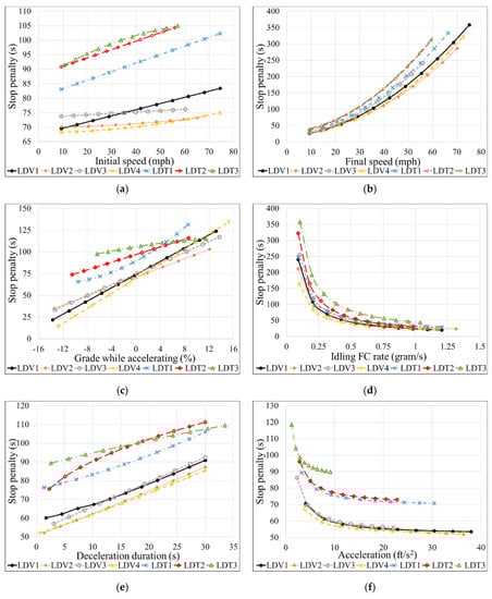 Parametric analysis of the developed models. (a) Initial speed vs. stop penalty; (b) Final speed vs. stop penalty; (c) Accelerating grade vs. stop penalty; (d) Idling FC rate vs. stop penalty; (e) Deceleration duration vs. stop penalty; (f) Acceleration vs. stop penalty.