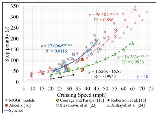 Stop penalty vs. cruising speed from various studies [13,15,16,21,23,24].