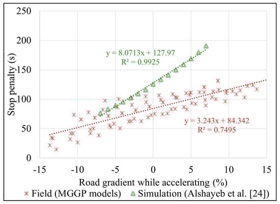 When comparing the MGGP stop penalties with those from the simulation models [24], Figure 11 shows that both data series depict the same trend (stop penalty correlates positively with the cruising speed), but it seems that the simulation-based stop penalties underestimate those from the field (e.g., either from this study or the results from Stevanovic et al. [23]). On the other hand, Figure 12, which compares the field and simulated stop penalties as functions of the road gradient, shows that the simulated data overestimated the field values. There could be several reasons for such differences between the field and simulated stop penalties (for both speeds and grades). One is the difference in the FC idling rate, which ranges from 0.1 to 1.3 g/sec in the field, whereas the range is smaller in the simulation (~0.20–0.6 g/sec). Or it could be that tested vehicle types in the field are very different from evaluated vehicle types in the simulation.