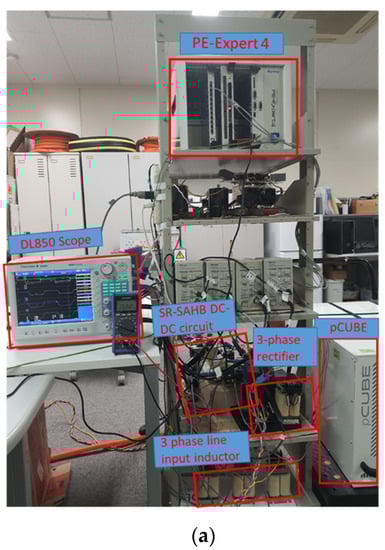 Figure 8a shows the experimental set up of the proposed SR-SAHB DC-DC converter. The input DC voltage is obtained by rectifying the three-phase AC voltages of 60 Hz and 200 V using the three-phase full-bridge diode rectifier circuit. The regenerative DC power supply pCUBE is used instead of the 265 VDC battery. The controller was the PE–Expert 4 system using DSP TMS320C6657, and the DL850 Yokogawa was used for measuring the voltage and current waveforms. The measured voltage and current waveforms were obtained directly from the DL850 using the Xviewer software.