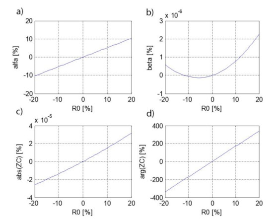 In order to evaluate how the values of wave and output parameters change when per unit length parameters are changed, a proprietary program has been written in the MATLAB environment. It allows for the acquisition of graphs of wave and output parameters values for a given frequency, load, input parameters, and variability of individual per unit length parameters (e.g., ±20%) at any value of supply voltage U1 and load Z2. The presented graphs were created for U1 = 100 V, Z2 = 100 Ω. Thus, with a change of per unit length resistance within ±20%, the damping factor α linearly increases from−10% to +10%, regardless of frequency (Figure 2a, Figure 3a and Figure 4a), while the phase factor β reaches a minimum around −5% and then increases, but these changes are very minor, approximately 10−5% for f = 100 kHz (Figure 2b), 10−6% for f = 500 kHz (Figure 3b), and 10−7% for f = 1 MHz (Figure 4b). As far as the wave impedance modulus and argument are concerned, they increase almost linearly, with the exception that the modulus changes for low frequencies are around 10−3% (Figure 2c) and for large ones, around 10−5% (Figure 3c and Figure 4c), whereas the argument changes are large, i.e., ±300% (Figure 2d, Figure 3d and Figure 4d).