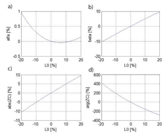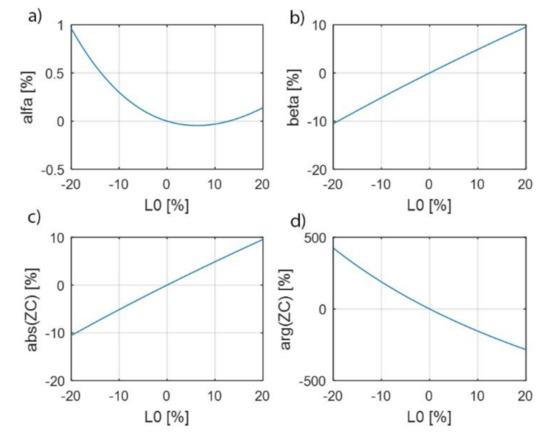 Changes to the damping factor alpha when changing parameter L0 are non−linear, and vary from 1% to 0.2%, regardless of frequency (Figure 5a, Figure 6a and Figure 7a). The factor β rises almost linearly from −10% to 10%, regardless of frequency (Figure 5b, Figure 6b and Figure 7b). The impedance modulus rises almost linearly in the range of −10% to 10% for all tested frequencies (Figure 5c, Figure 6c and Figure 7c). The argument changes linearly in the range from approximately 200% to −400%, with minor changes for individual frequencies (Figure 5d, Figure 6d and Figure 7d).