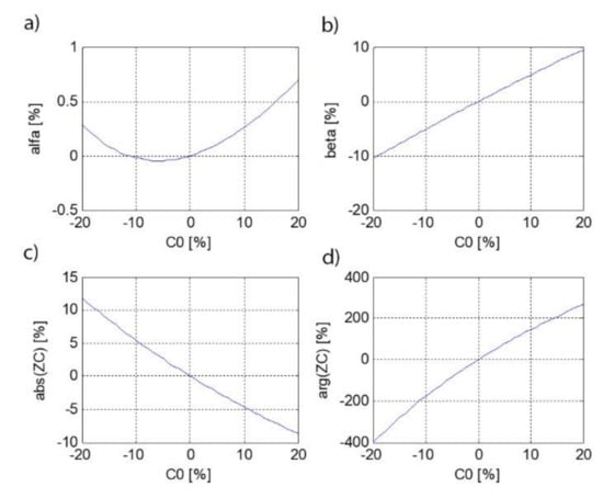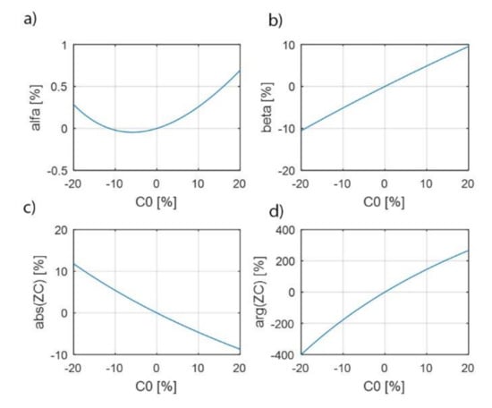 Changes to the damping factor alpha when changing parameter C0 are non−linear, and vary from 0.25% to 1.4%, regardless of frequency (Figure 8a, Figure 9a and Figure 10a). The factor β rises almost linearly from −10% to 10%, regardless of frequency (Figure 8b, Figure 9b and Figure 10b). The impedance modulus rises almost linearly in the range of 12% to −8% for all tested frequencies (Figure 8c, Figure 9c and Figure 10c). The argument changes linearly in the range from approximately −400% to 280%, with minor changes for individual frequencies (Figure 8d, Figure 9d and Figure 10d).
