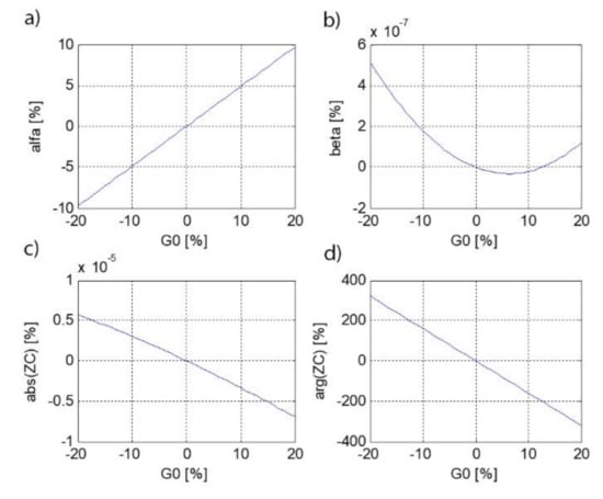 Changes to the damping factor alpha when changing the G0 parameter are non−linear, and vary from 1% to 0.2% regardless of frequency (Figure 11a, Figure 12a and Figure 13a). The factor β rises almost linearly from −10% to 10%, regardless of frequency (Figure 11b, Figure 12b and Figure 13b). The impedance modulus rises almost linearly in the range of −10% to 10% for all tested frequencies (Figure 11c, Figure 12c and Figure 13c). The argument changes linearly in the range from approximately 40% to −200% with minor changes for individual frequencies (Figure 11d, Figure 12d and Figure 13d).