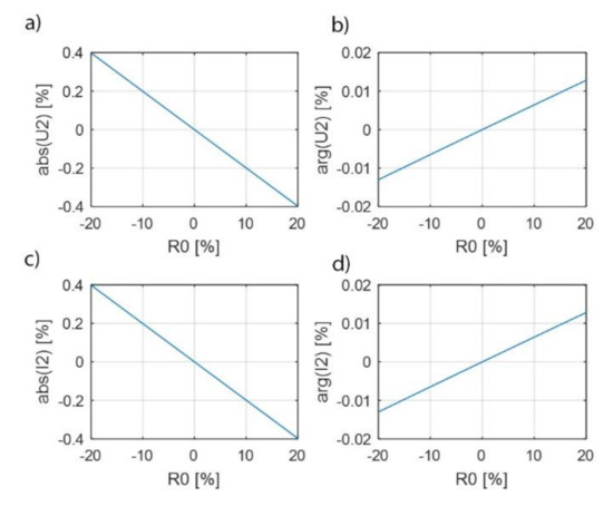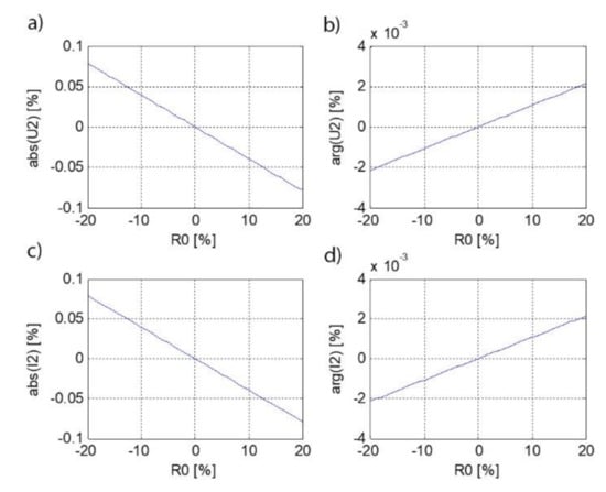 Changes to the U2 voltage modulus occur when the R0 parameter is changed linearly, and vary from 0.4% to −0.4%, depending on the frequency. The higher the frequency, the smaller the change (Figure 14a, Figure 15a and Figure 16a). The U2 argument increases almost linearly from −2% to 2%, depending on the frequency (Figure 14b, Figure 15b and Figure 16b). The I2 Modulus changes linearly from 0.4% to −0.4% for lower frequencies, and 0.04% to −0.04% for higher tested frequencies (Figure 14c, Figure 15c and Figure 16c). The I2 argument rises linearly from −2.1% to 2.1% for 500 kHz, and −0.13% to 0.13% for 1 MHz (Figure 14d, Figure 15d and Figure 16d).