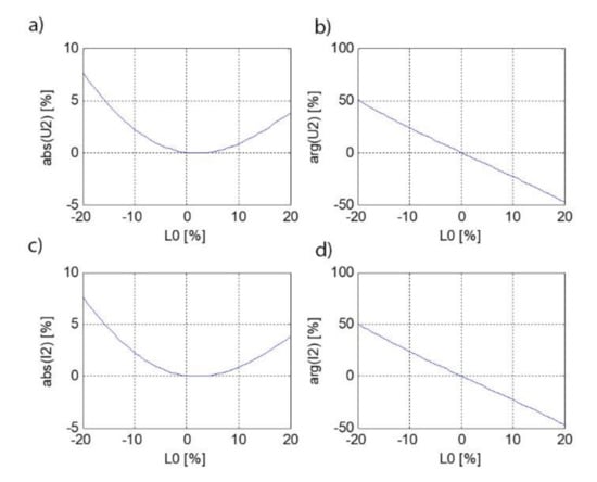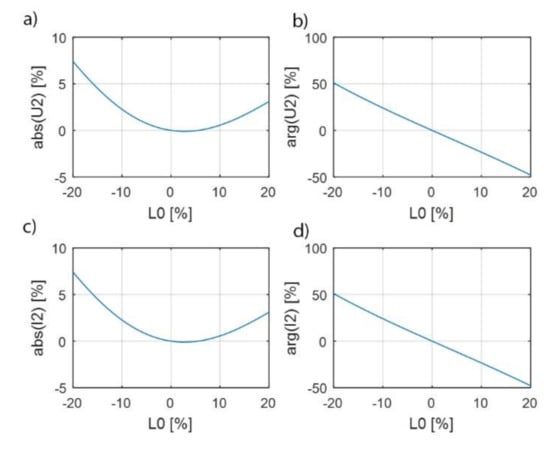 Changes of U2 voltage modulus occur when L0 parameter is changed parabolically, and change from 7.5% to −3%, regardless of frequency. (Figure 17a, Figure 18a and Figure 19a). The U2 argument falls almost linearly from 50% to −50%, independently of the frequency (Figure 17b, Figure 18b and Figure 19b). The I2 modulus changes parabolically in the range of 7.5% to 4%, with slight differences depending on the frequency (Figure 17c, Figure 18c and Figure 19c). The I2 argument falls linearly in the range from 50% to −50%, independently of the frequency (Figure 17d, Figure 18d and Figure 19d).