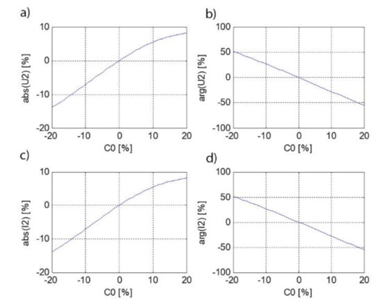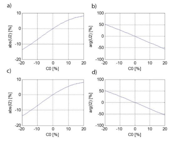 Changes of the U2 voltage modulus occur when parameter C0 is changed non−linearly, and change from −14% to 8% independently of frequency. (Figure 20a, Figure 21a and Figure 22a). The U2 argument falls almost linearly from 50% to −50%, independently of frequency (Figure 20b, Figure 21b and Figure 22b). The I2 modulus changes from −14% to 8%, independently of the frequency (Figure 20c, Figure 21c and Figure 22c). The I2 argument decreases linearly in the range from 50% to −50%, independently of the frequency (Figure 20d, Figure 21d and Figure 22d).