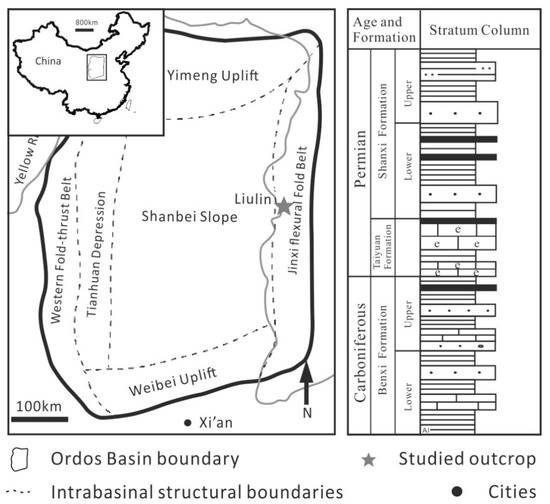 The Ordos Basin is a cratonic basin and consists of six secondary tectonic units, including Yimeng Uplift, Western Fold-thrust Belt, Tianhuan Depression, Shanbei Slope, Jinxi Flexural Fold Belt, and Weibei Uplift [4,6,7,22,23,24,25] (Figure 1). The studied section is located in the Liulin city, Shanxi Province, eastern Ordos Basin, located in the Jinxi Flexural Fold Belt. The Ordos Basin has experienced a general evolution trend from marine to transitional to continental environment. From the Proterozoic to early Paleozoic, the Ordos Basin was submerged under seawater, depositing thick carbonates. From the Ordovician to early Carboniferous, the Caledonian movement uplifted the basin, leading to denudation of strata [22,23,24,25]. In the late Carboniferous, North China experienced continuous subsidence resulting from Hercynian movement, sea water entered the basin from the northeastern direction, and marine strata were deposited in the Ordos Basin. In the late Permian, because of collision of the late Hercynian movement, seawater was forced to recede towards the southwestern direction, and fluvio-lacustrine deposition started in the entire Ordos Basin [26].