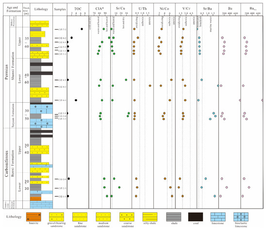 Similarly, trace elopement strontium (Sr) and copper (Cu) are climate-sensitive, and hence, Sr/Cu ratios are commonly used to reflect paleoclimate conditions, despite that Cu-bearing syngenetic or detrital sulfide minerals or Sr-bearing barite can influence the concentrations of Sr and Cu. Sr is easy to lose because of weathering, especially in warm conditions, whereas Cu can stay relatively stable. Instead, dry and hot conditions lead to higher Sr/Cu ratios due to the accumulation of Sr in the parent rock. Many authors use Sr/Cu ratios to reflect paleoclimate conditions, assuming Sr/Cu ratio of 1–5 to indicate warm and humid conditions and Sr/Cu ratio higher than 5 to indicate dry and hot conditions [37]. Whereas Sr is sometimes related to Ca in carbonates, Sr/Cu ratio is perhaps not a suitable proxy to evaluate the paleoclimate conditions of samples with high Ca content. For this reason, the Sr/Cu ratio of Taiyuan Formation is not considered, whereas the Benxi Formation has a Sr/Cu ratio of 2.56–16.93, with an average value of 8.92, suggesting dry and hot climate; the Shanxi Formation has a Sr/Cu ratio of 2.08–7.24, with an average value of 4.13 m, suggesting warm and humid conditions (Table 4).