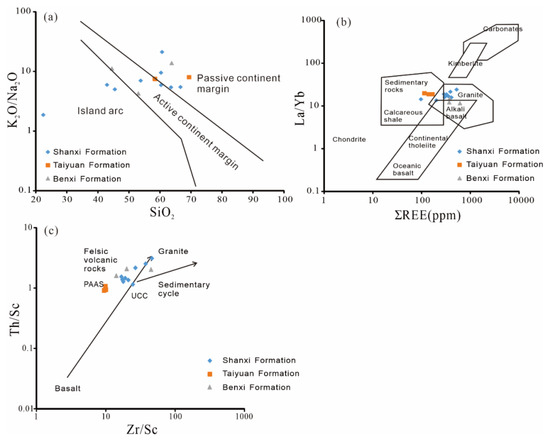 As the increase of sandstone maturity, feldspars, and other contents in the sandstone can be transformed into potassium-rich clay minerals, the K2O/Na2O ratio increases accordingly [32]. Therefore, the (K2O/Na2O)–SiO2 plot can be used to determine the structural background (Figure 5). The results show that the Benxi Formation lies within the area of active continental margin, the Taiyuan Formation lies within the area of passive continental margin, while the Shanxi Formation lies within the area of active and passive continental margin. The ΣREE-La/Yb sediment source plot shows that the Benxi Formation is sourced from alkali basalt, the Taiyuan Formation is mainly sourced from sedimentary rocks, whereas the Shanxi Formation is mainly sourced from felsic granite. The Th/Sc–Zr/Sc plot shows that the content of the shales in the Taiyuan Formation is mostly similar with the PAAS, whereas the Benxi Formation and the Shanxi Formation are more prone to felsic igneous rocks. Overall, through analyses of major elements, trace elements, and rare earth elements, the Shanxi Formation was sourced from intermediate-acid rocks including felsic igneous rocks and felsic granites, perhaps from the Yinshan Oldland in the northwest direction [20,33].