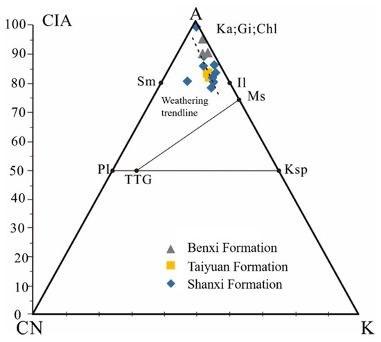 The samples of the studied area have CIA values of 77.2–97.98, with an average value of 84.76 (Table 1), suggesting the source area experienced weak weathering and the paleoclimate was cold and dry. Vertical trends of CIA show that, from Benxi Formation to Taiyuan Formation, the paleoclimate changed from dry and humid to warm and humid, and in the late deposition period of Shanxi Formation, the paleoclimate changed to dry and humid again.