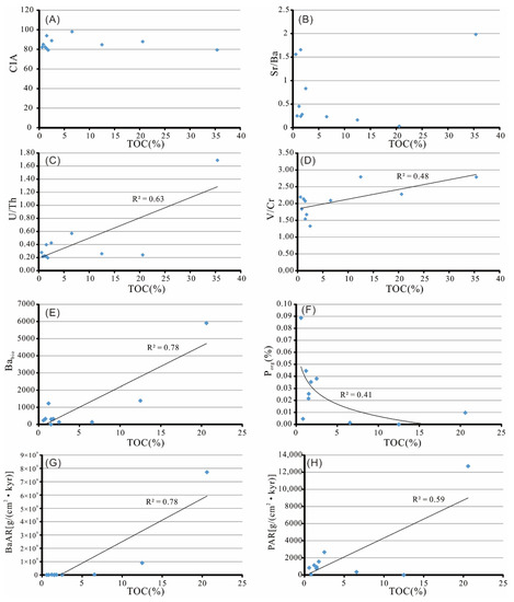 Correlation of TOC with paleoclimate, paleo-water salinity, paleoproductivity, and paleoredox proxies: (A) Correlations between TOC and CIA; (B) Correlations between TOC and Sr/Ba; (C) Correlations between TOC and U/Th; (D) Correlations between TOC and V/Cr; (E) Correlations between TOC and Babio; (F) Correlations between TOC and Porg; (G) Correlations between TOC and BaAR; (H) Correlations between TOC and PAR.