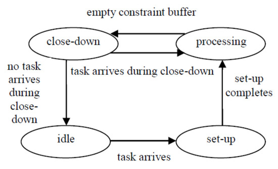 The sojourn time μn of task n = 1 … N depends on flow type, serial, parallel and serial–parallel. The transitions among the shutdown, setup and processing times are presented in Figure 1.