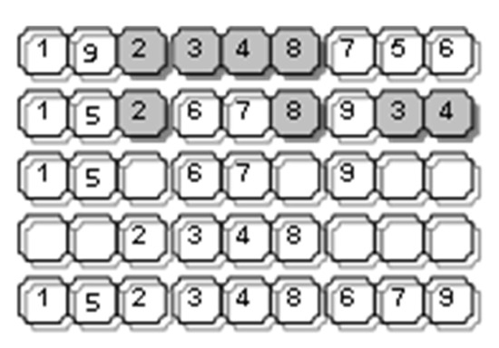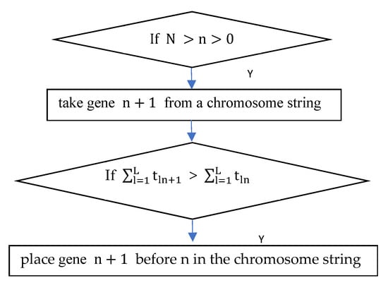 In the modified LOX procedure [65], the set of genes from the first chromosome is selected randomly (Figure 9). Selected genes are removed from the first parent chromosome, leaving gaps. Free spaces are shifted from the extreme positions to the central part. In the offspring chromosome, empty space is filled by the remaining sequences of the genes of the second parent chromosome.