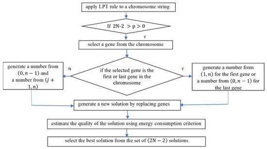 The random insertion perturbation scheme (RIPS) has been adapted to the task scheduling problem (Figure 6). This procedure is based on a local search for solution spaces around the solution generated using the LPT rule. The best neighborhood antibody is introduced into the initial population. The generated schedules are assessed according to the energy consumption criterion. In RIPS, a single number is randomly generated for the first and last jobs of the chromosome as they can only be shifted in one direction. The rest of the genes can be shifted in both directions.