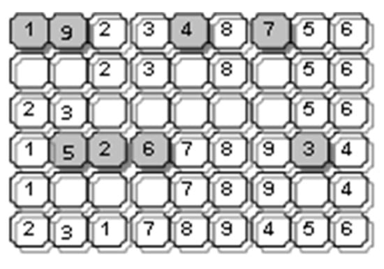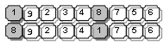 In the OX procedure, a gene sequence is selected from the chromosome of the first parent [64,65]. The selected gene sequence is copied at the given positions to create the offspring chromosome. The selected genes are removed from the chromosome of the other parent. The genes required to complete the progeny chain remain. Going from left to right, the genes are copied in the order of the chromosome of the other parent (Figure 7).