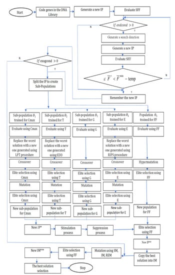 Better solutions can be obtained by starting the process of immunological optimization from points of interest in the solutions space. The solution space search process is continued for promising points (schedules) obtained with heuristics based on priority rules. When using the makespan criterion, the Least Processing Time (LPT) rule is proposed (Figure 4). The tasks that require the longest execution time are performed first.