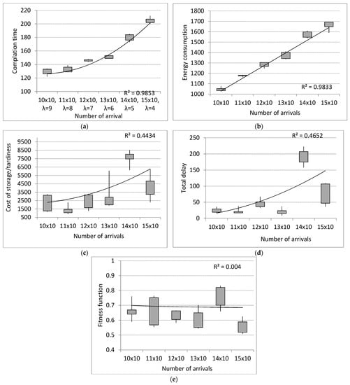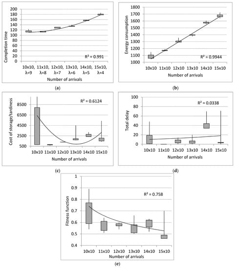 The influence of arrival intensity on (a) makespan, (b) cost of energy consumption, (c) cost of tardiness or premature execution, (d) total delay of tasks, (e) scalar fitness function for parallel flow.