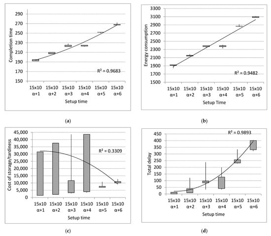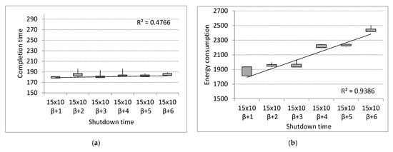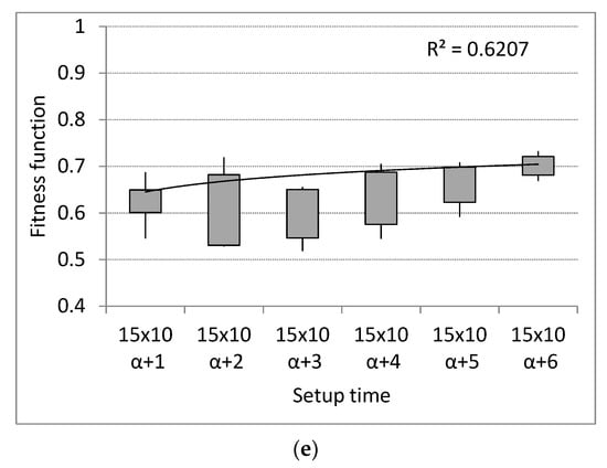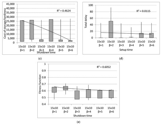 Here, the effect of different values of of two successive tasks on performance and cost-effective criteria for the serial flow of a batch accepted for execution is examined. Let us observe this characteristic after T = 250 (min), assuming predefined values for processing times , setup times , and shutdown times . Computer simulations were performed for six different values of , namely {9, 8, 7, 6, 5, 4} (min) and the maximum system capacity N = 15. The results of the experiment are presented in Figure 19. It can also be noted that a slight change in the number of incoming tasks increases the makespan criterion more and more for the serial flow (Figure 19a). The cost of energy consumption increases with the number of orders accepted for execution (Figure 19b). The tardiness or premature execution measurement increases with the number of tasks from 11 to 14. The cost of tardiness or premature execution decreases for 15 tasks (Figure 19c). The cost of tardiness or premature execution is strongly related to the total delay criterion. Schedules are unfeasible because tasks are delayed for each scheduling problem (Figure 19d). A decreasing SFF value means that the worst quality solution improves with an increase in the number of incoming orders (Figure 19e).