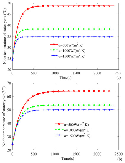 When the convective heat transfer coefficient α takes different values with or without assembly clearance (hac = 0.03 mm), the transient temperature curve with time is obtained, as shown in Figure 5. For the given stator yoke loss (Psta_yo = 410 W), the time of reaching the node steady temperature depends on the cooling ability of heat dissipation to the ambient air and thermal resistance along the heat transfer path. In other words, the increase in heat transfer convection coefficient α and the decrease in assembly clearance help to reduce the node temperature rise and shorten the time to reach the steady state (about 2500 s).