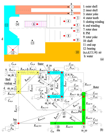 A half 40 kW IPMSM model and LPTN of temperature node distribution are built for its axial symmetry in Figure 7a,b in this paper. For the transient thermal network model, the IPMSM model is divided into the following 14 parts: (1) outer shell, (2) inner shell, (3) stator yoke, (4) stator tooth, (5) slotted winding, (6) end winding, (7) rotor shoe, (8) PM, (9) rotor yoke, (10) shaft, (11) end cap, (12) bearing, (13)–(14) inner air, (a), (c), (d) ambient air and (b) water.