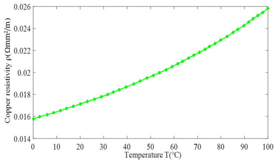 where T0 is ambient temperature (°C), ρ0 is the electrical resistivity of copper at 0 °C (ρ0 = 0.0165 Ω mm2/m), ρ20 is the electrical resistivity of copper at 20 °C (ρ20 = 0.0176 Ω mm2/m), and α is the temperature coefficient of copper (α = 0.0039/°C). The winding copper resistivity ρ increases slightly with the increase in temperature T as shown in Figure 8.