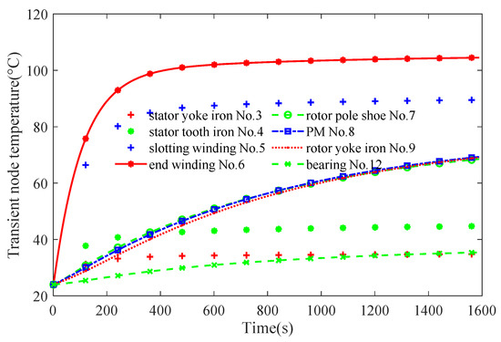 Based on the LPTN of IPMSM in Figure 7b and Equations (7)–(13), transient node temperature curves of the main heat sources are given in Figure 9.