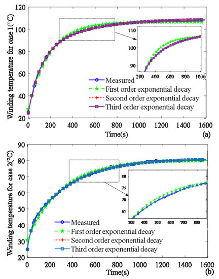 First-order, second-order, and third-order exponential decay functions are used to predict the transient winding temperature for two operating points, which are given as